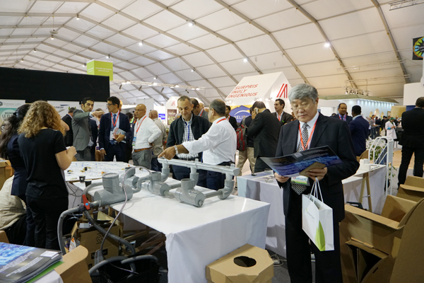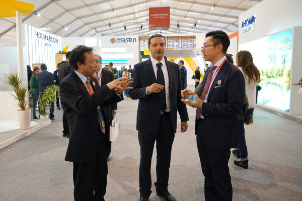 ??? 11月8日上午,在摩中商會、摩洛哥外貿銀行、香港匯盛資本等機構負責人的陪同下,紀勤應總經理一行參觀了聯(lián)合氣候大會主展館。展會現(xiàn)場來自世界各地節(jié)能環(huán)保產業(yè)技術展示、部分獨具匠心的展臺設計展現(xiàn)出的世界各國實現(xiàn)綠色循環(huán)低碳發(fā)展,推進清潔能源、可再生資源,應對氣候變化、追求美好未來的決心等給考察團一行留下了深刻的印象。