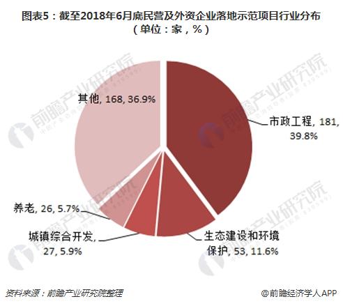 ? ? 從民營企業參與行業來看,截至2018年6月底,866個落地示范項目中,民營的非聯合體項目以及含民營、港澳臺及外資的聯合體兩類項目數合計455個,占落地項目數的52.5%。民企參與的行業涵蓋全部19個行業,其中市政工程181個,占比39.8%;生態建設和環境保護53個,占比11.6%;城鎮綜合開發27個,占比5.9%;養老26個,占比5.7%,其余皆為25個以下。