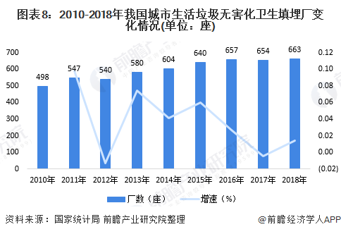 從無害化處理企業來看,2010-2018年,我國城市生活垃圾無害化衛生填埋和焚燒廠數呈逐年增加趨勢。2018年,我國城市生活垃圾無害化衛生填埋廠共663座,同比增加9座;無害化城市生活垃圾焚燒場數量為331座,同比增加45座。