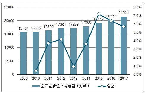 2009-2017年全國生活垃圾清運量統(tǒng)計及增速