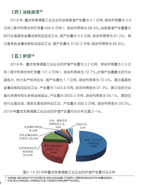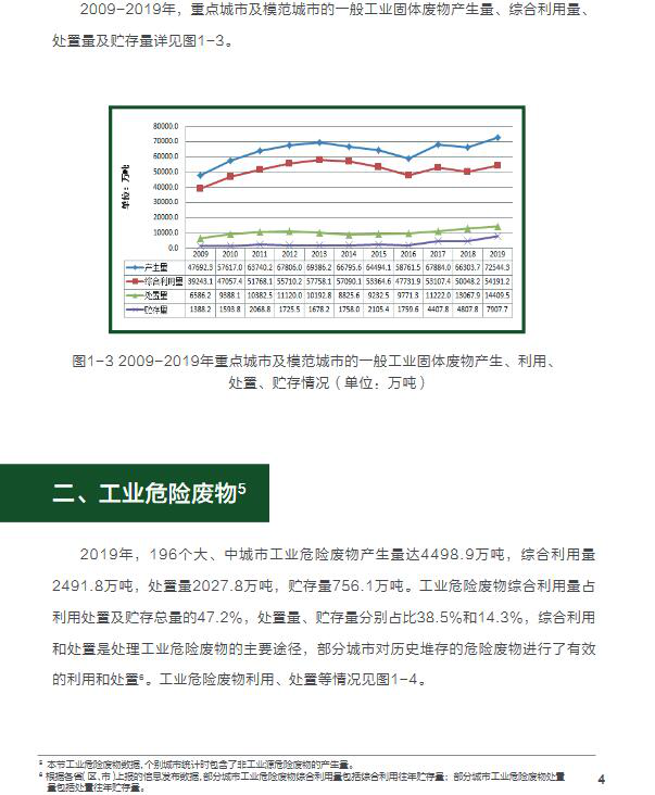 2019年,196個(gè)大、中城市一般工業(yè)固體廢物產(chǎn)生量達(dá)13.8億噸,綜合利用量8.5億噸,處置量3.1億噸,貯存量3.6億噸,傾倒丟棄量4.2萬(wàn)噸。一般工業(yè)固體廢物綜合利用量占利用處置及貯存總量的55.9%,處置和貯存分別占比20.4%和23.6%,綜合利用仍然是處理一般工業(yè)固體廢物的主要途徑,部分城市對(duì)歷史堆存的一般工業(yè)固體廢物進(jìn)行了有效的利用和處置。