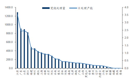 ? ? 從全國各省情況來看,2017年江蘇生活垃圾焚燒產能位居第一,年焚燒量為1287.7萬噸,日處理產能為3.53萬噸/日,其次是廣東、山東、浙江、福建。從生活垃圾焚燒產能發達的省份區域分布來看,多分布于長三角和珠三角一帶。一方面與當地人口較多,生活垃圾產生量較大相關,另一方面當地經濟發達,垃圾焚燒投資壓力對地方政府來說并不大。