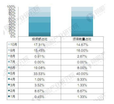 ? ? 分月度來(lái)看,5月份公布的建設(shè)項(xiàng)目最多,共有30個(gè)、22.2億元投資額的在建、擬建項(xiàng)目,項(xiàng)目數(shù)量、投資額占比分別為40%、33.53%;7月無(wú)新建項(xiàng)目,1月、4月、8月投資額均不到1億元。
