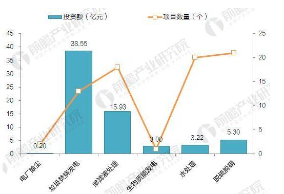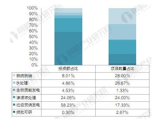? ? 從項(xiàng)目細(xì)分領(lǐng)域來(lái)看,脫硝脫硫領(lǐng)域的建設(shè)項(xiàng)目最多,共有21個(gè)在建、擬建項(xiàng)目,占比達(dá)28%;垃圾焚燒發(fā)電領(lǐng)域共有13個(gè)項(xiàng)目,但投資額達(dá)到38.55億元,占投資額的比重為58.23%;滲濾液處理領(lǐng)域的項(xiàng)目數(shù)量共18個(gè),僅次于脫硝脫硫和水處理,投資額為15.93億元。