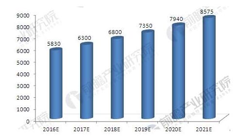 2016-2021年中國工業(yè)固體廢物市場容量預(yù)測(cè)(單位:億元)